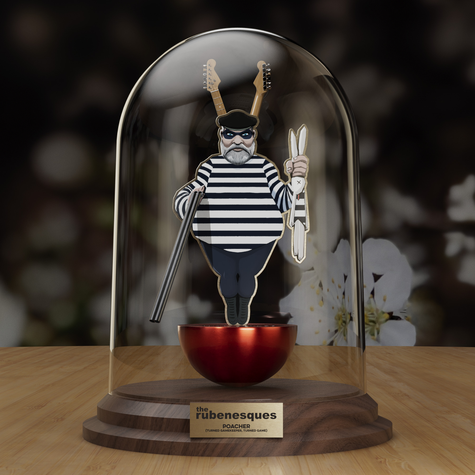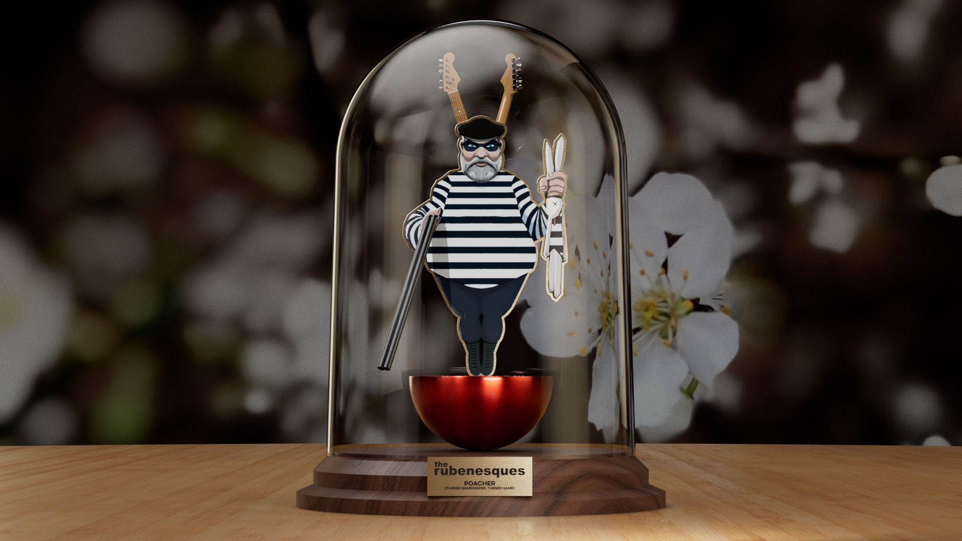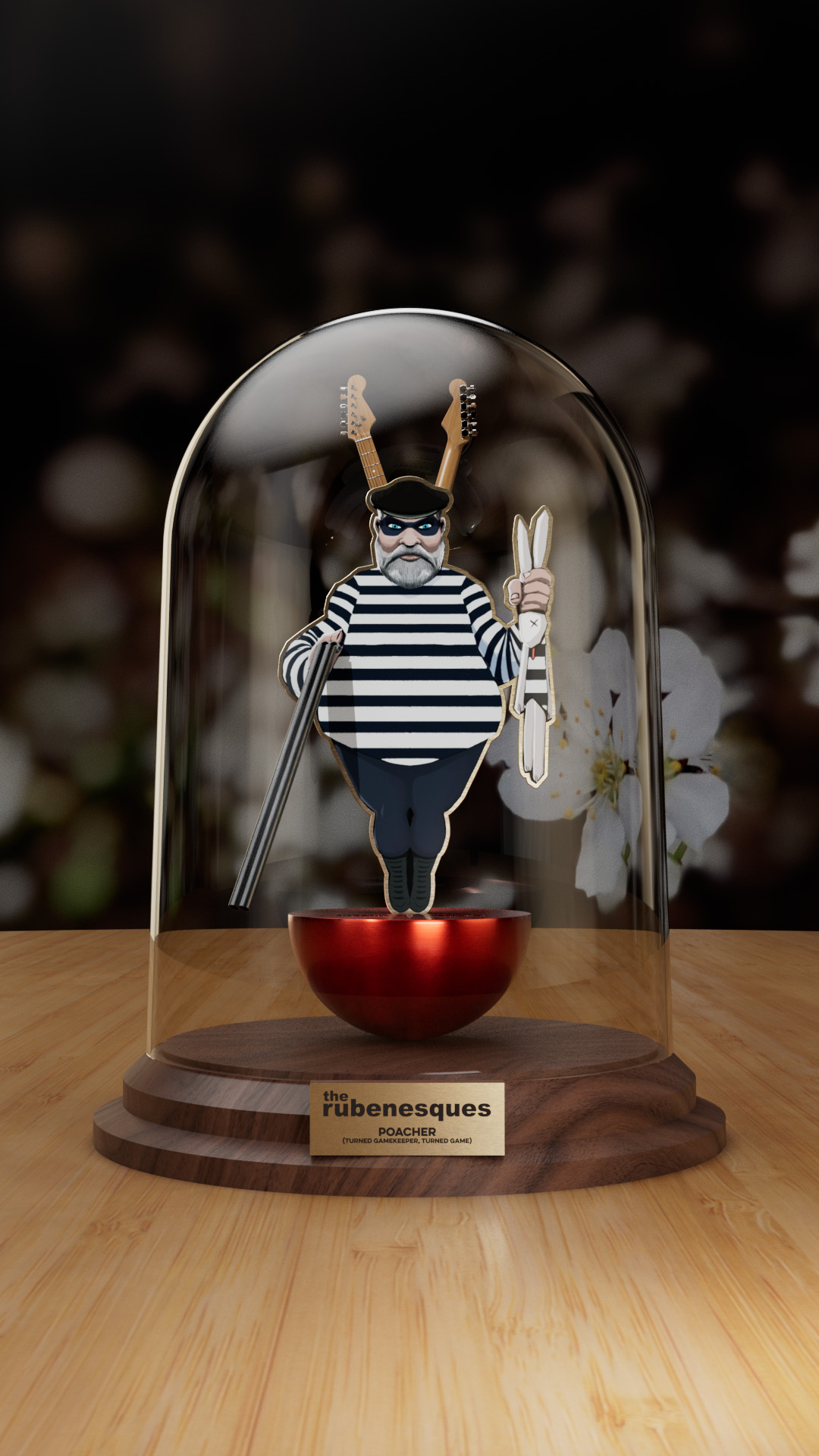 Rendered product shot of an illustrated character in a bell jar.